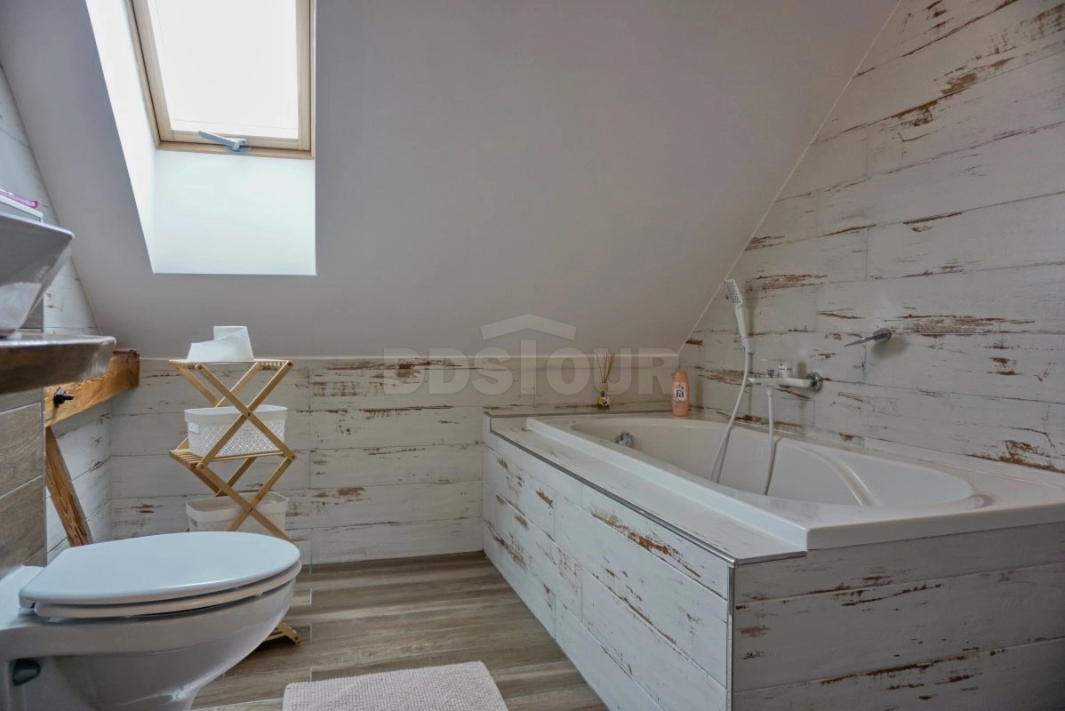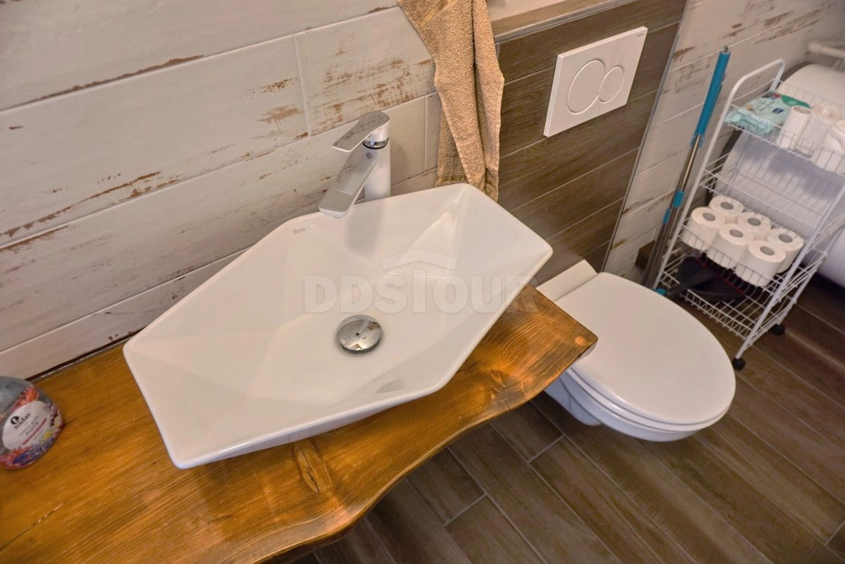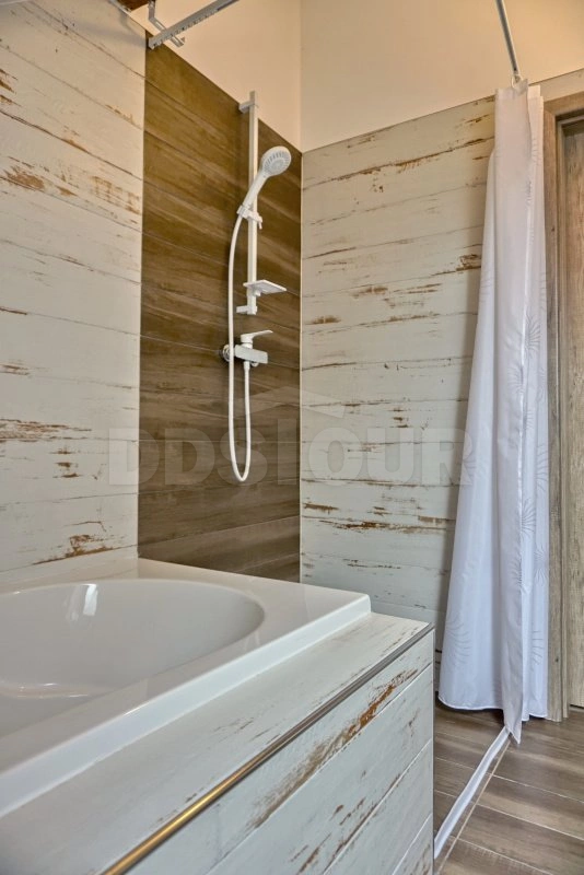 V koupelně naleznete umyvadlo sprchový kout i vanu včetně WC. Druhé WC je k dispozici samostatně. Samozřejmostí je SMART TV s pozemním i satelitním příjmem programů v HD kvalitě.