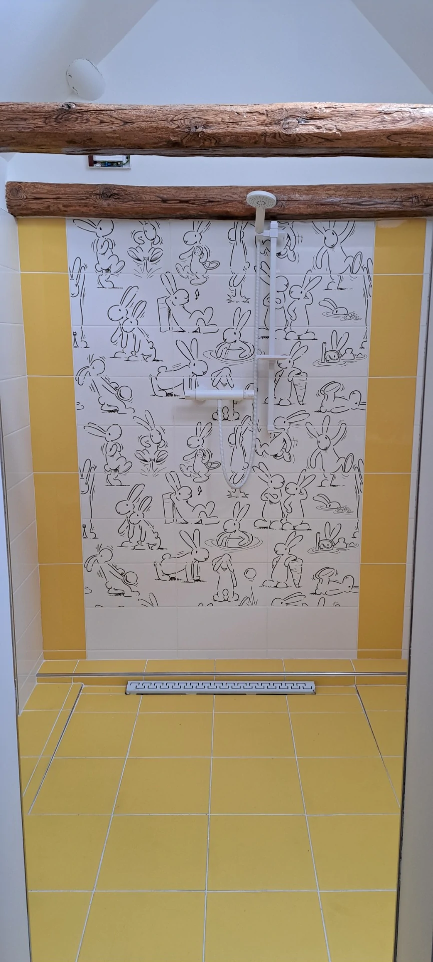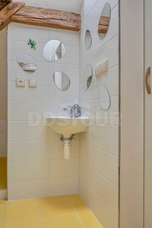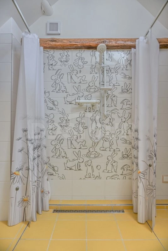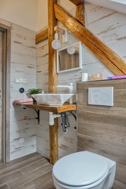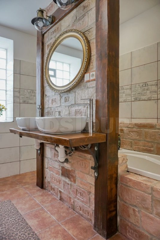 Koupelna stylová složená z původních vybouraných cihel tzv. zvonivek se signaturami nejenom místních cihelen nabízí jak vanu, tak sprchu v dostatečně velkém prostoru, kde i více osob bude mít dostatek prostoru. WC je samostatné přístupné z chodby.