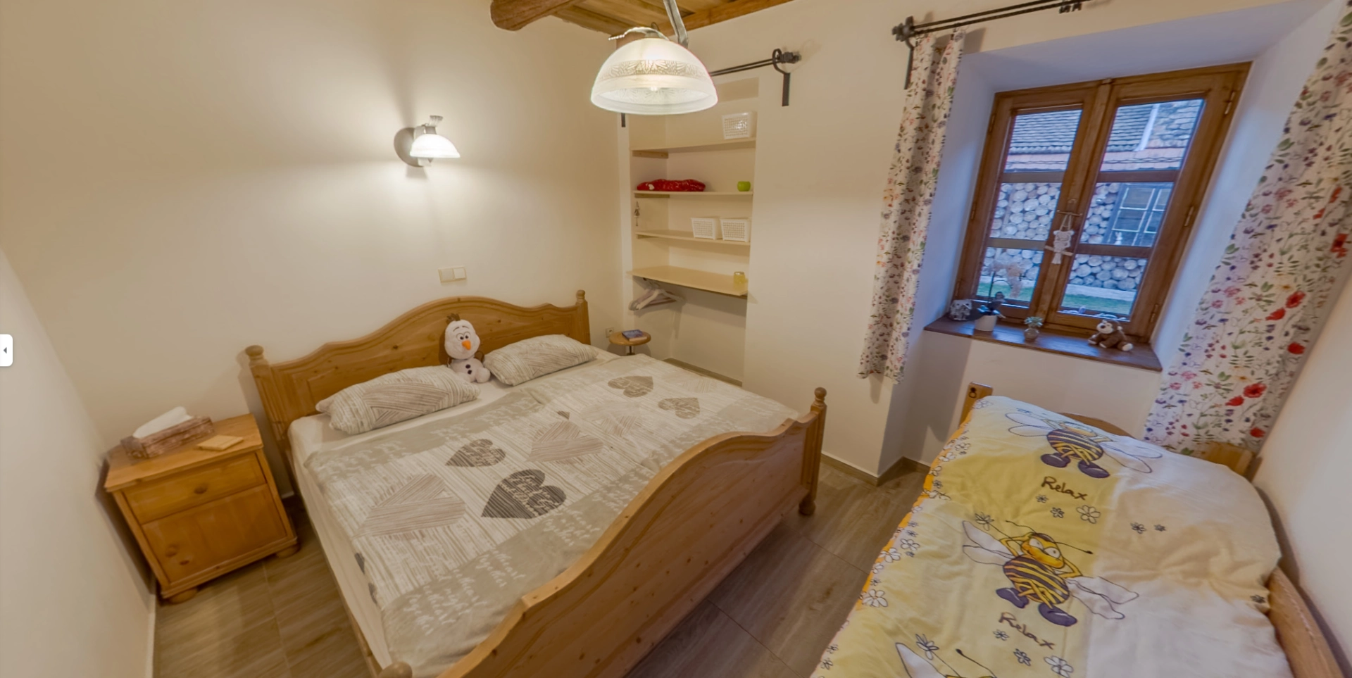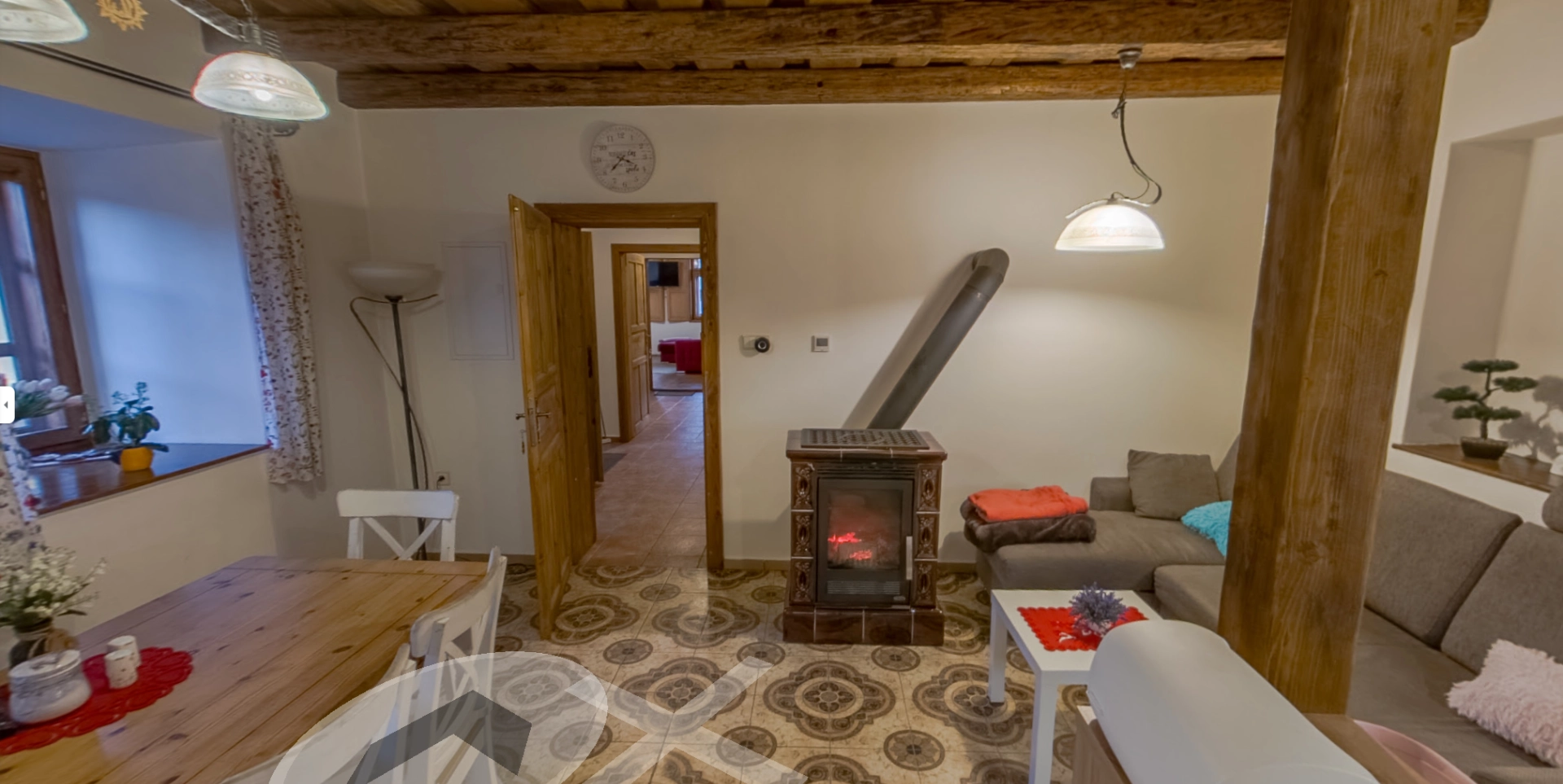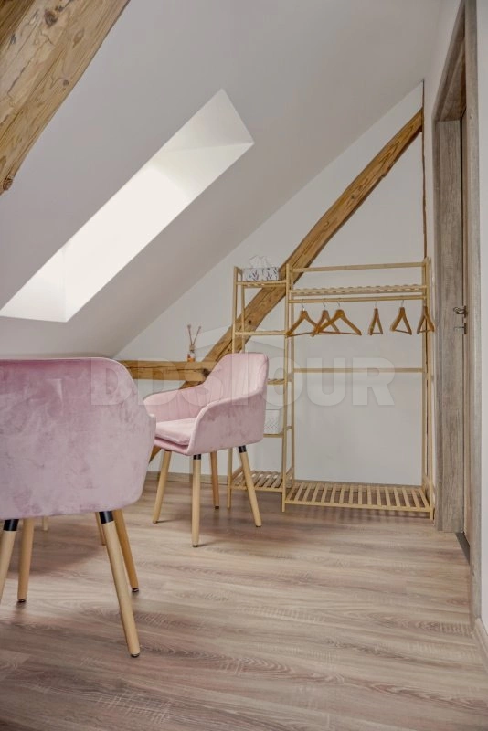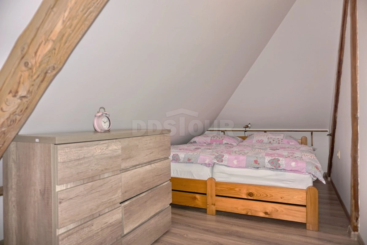 Rustikální prvky, jako jsou dřevěné trámy, přírodní materiály a květinové závěsy, podtrhují jedinečný styl tohoto ubytování, které je ideální pro klidný pobyt v malebném prostředí.