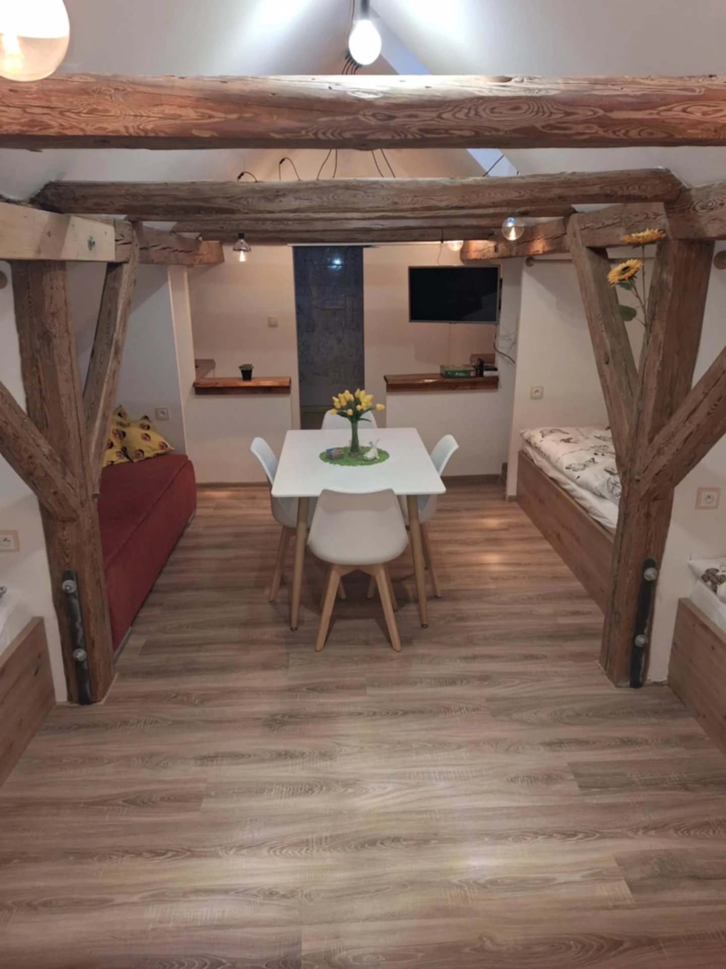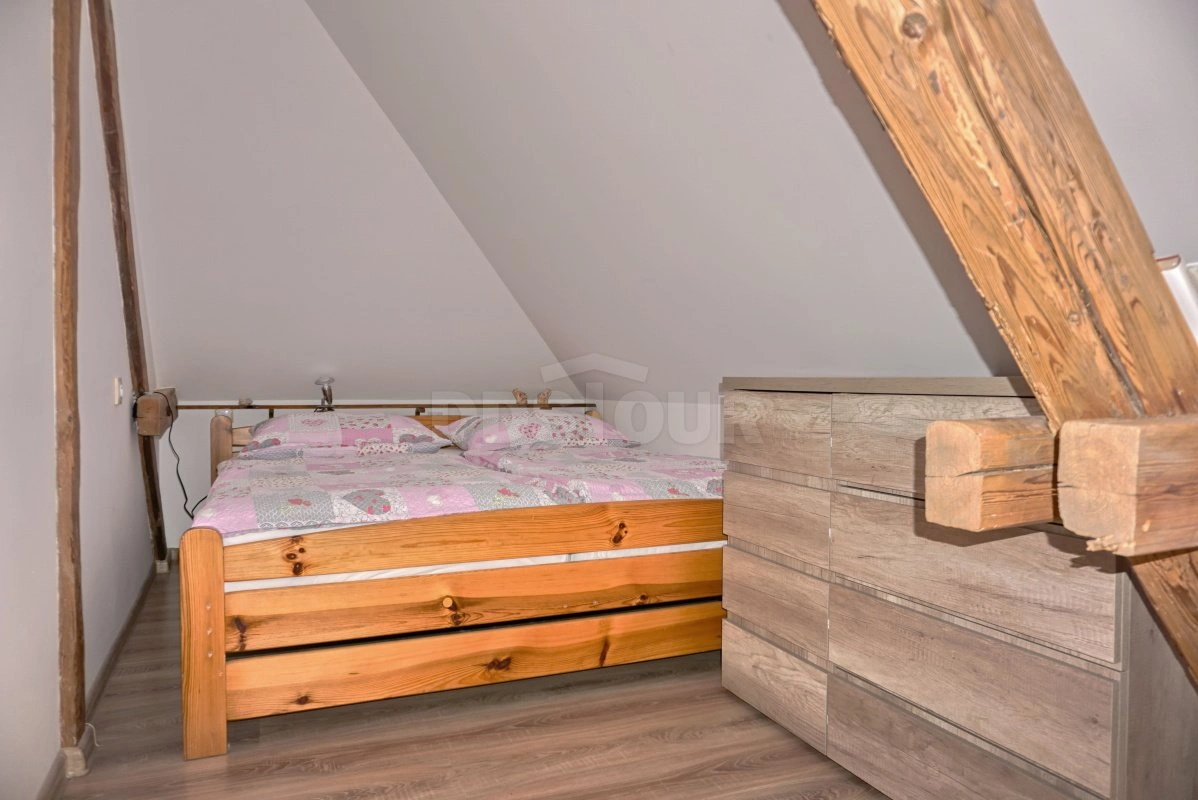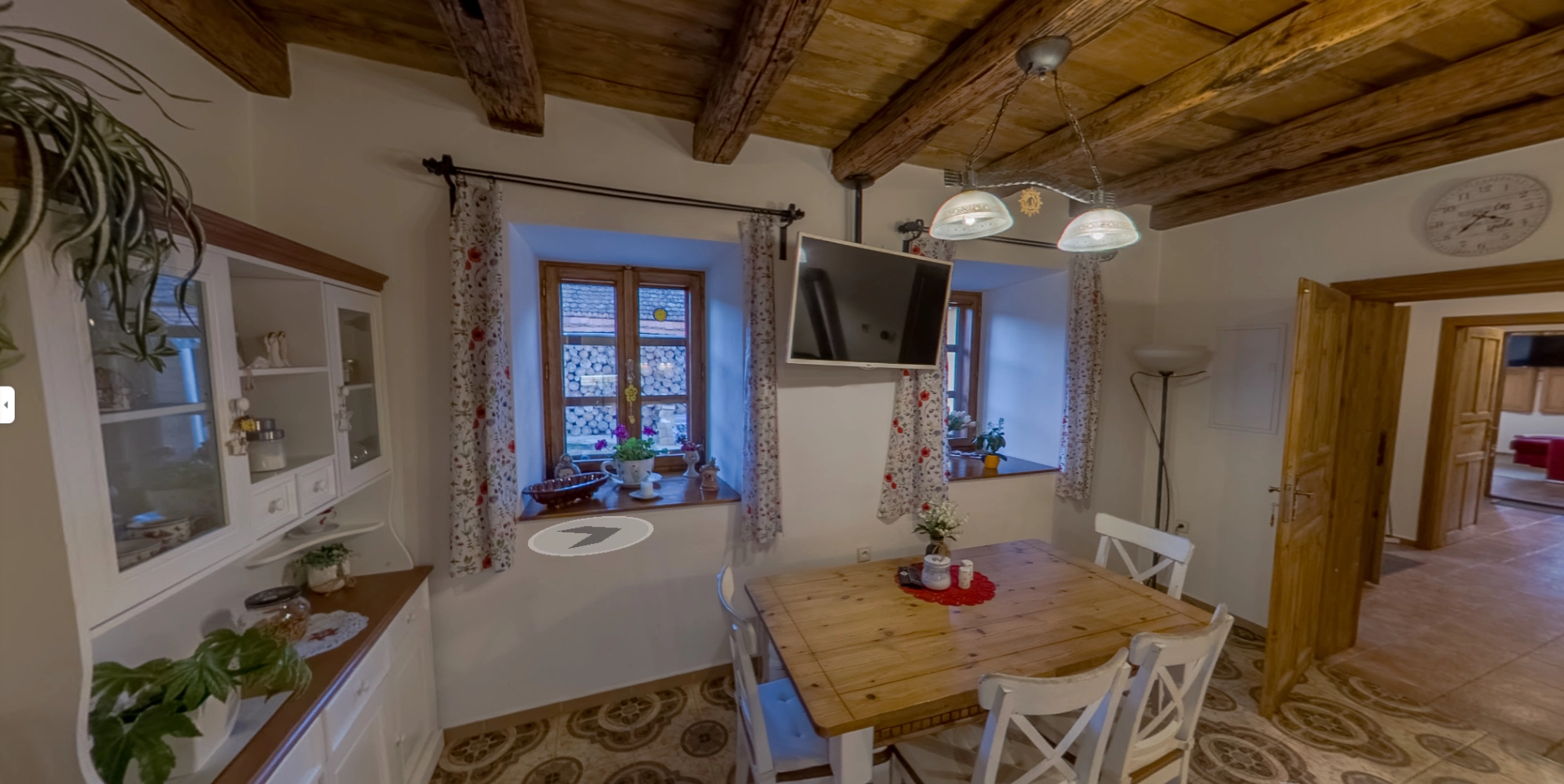Rustikální prvky, jako jsou dřevěné trámy, přírodní materiály a květinové závěsy, podtrhují jedinečný styl tohoto ubytování, které je ideální pro klidný pobyt v malebném prostředí.