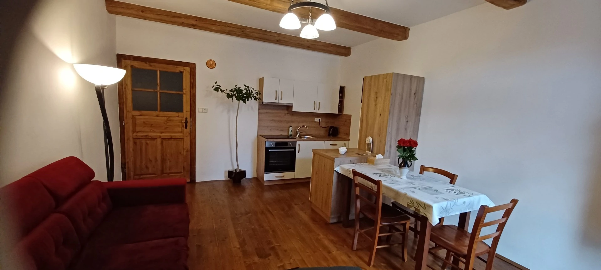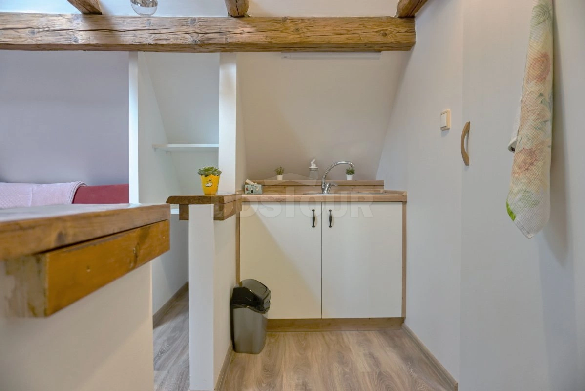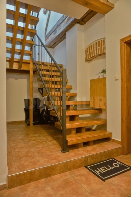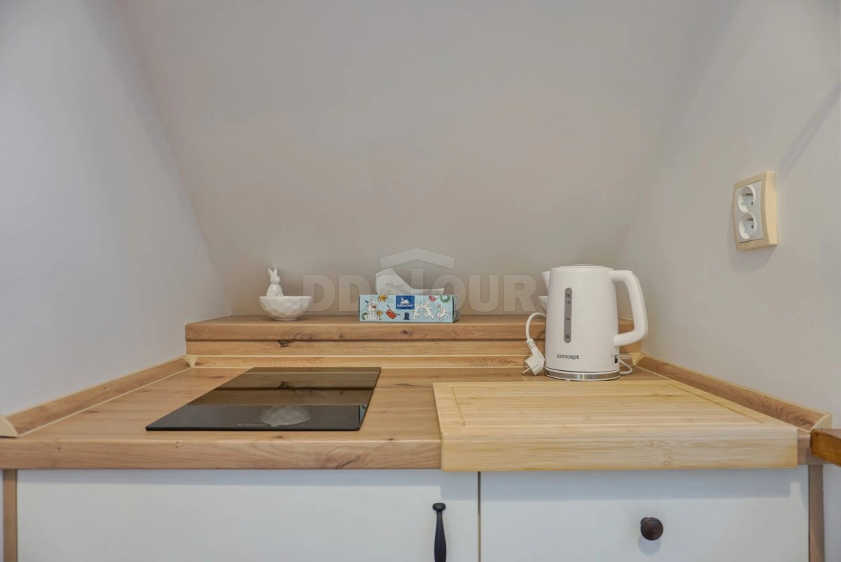 Útulná kuchyně je vybavena dřevěným stolem, bílým kredencem a nechybí ani televize. V obývací části s kuchyňským koutem se nachází pohodlná pohovka a tradiční stropní trámy vytvářejí příjemnou atmosféru. Ložnice s manželskou postelí a dalším lůžkem z masivního dřeva nabízí dostatek prostoru pro odpočinek. Apartmán je dále vybaven koupelnou s vanou a samostatným WC.