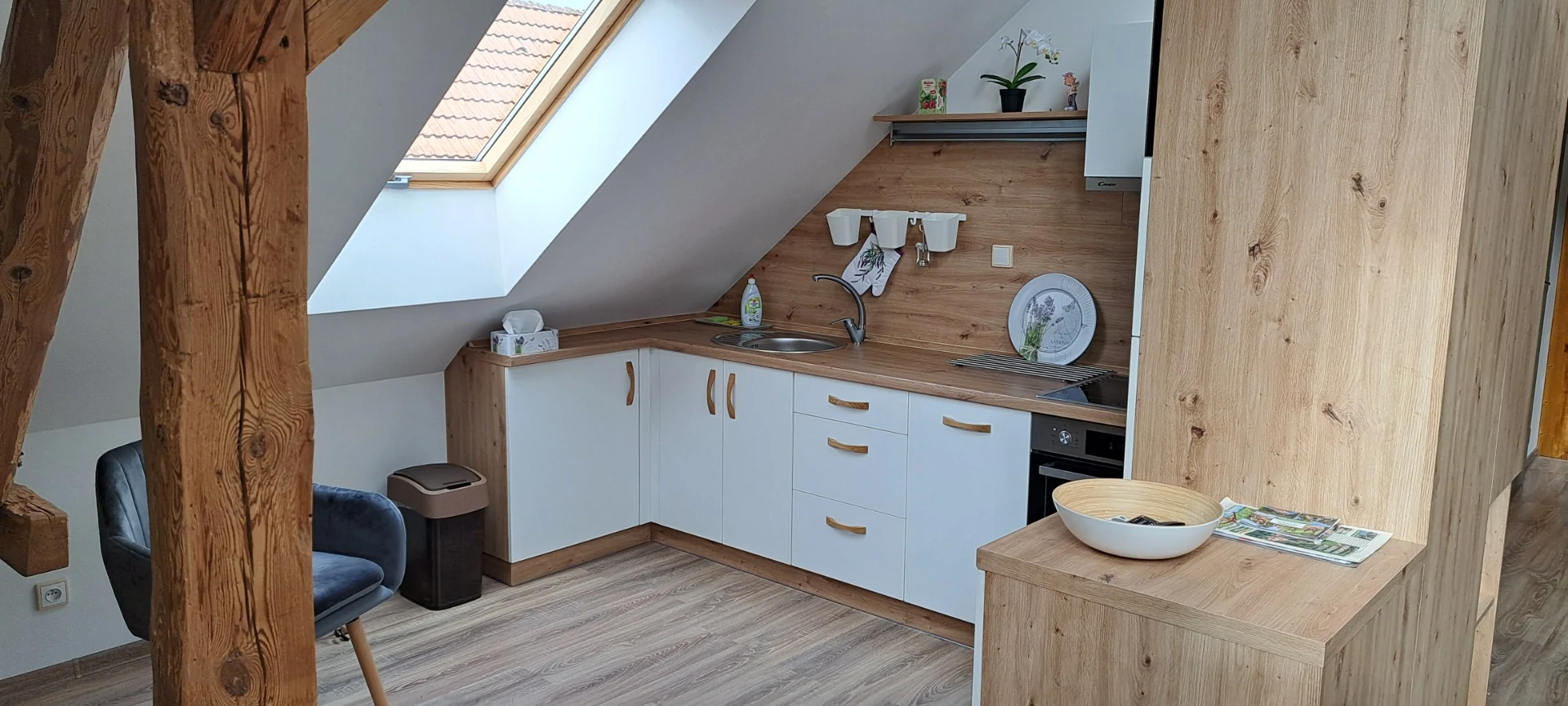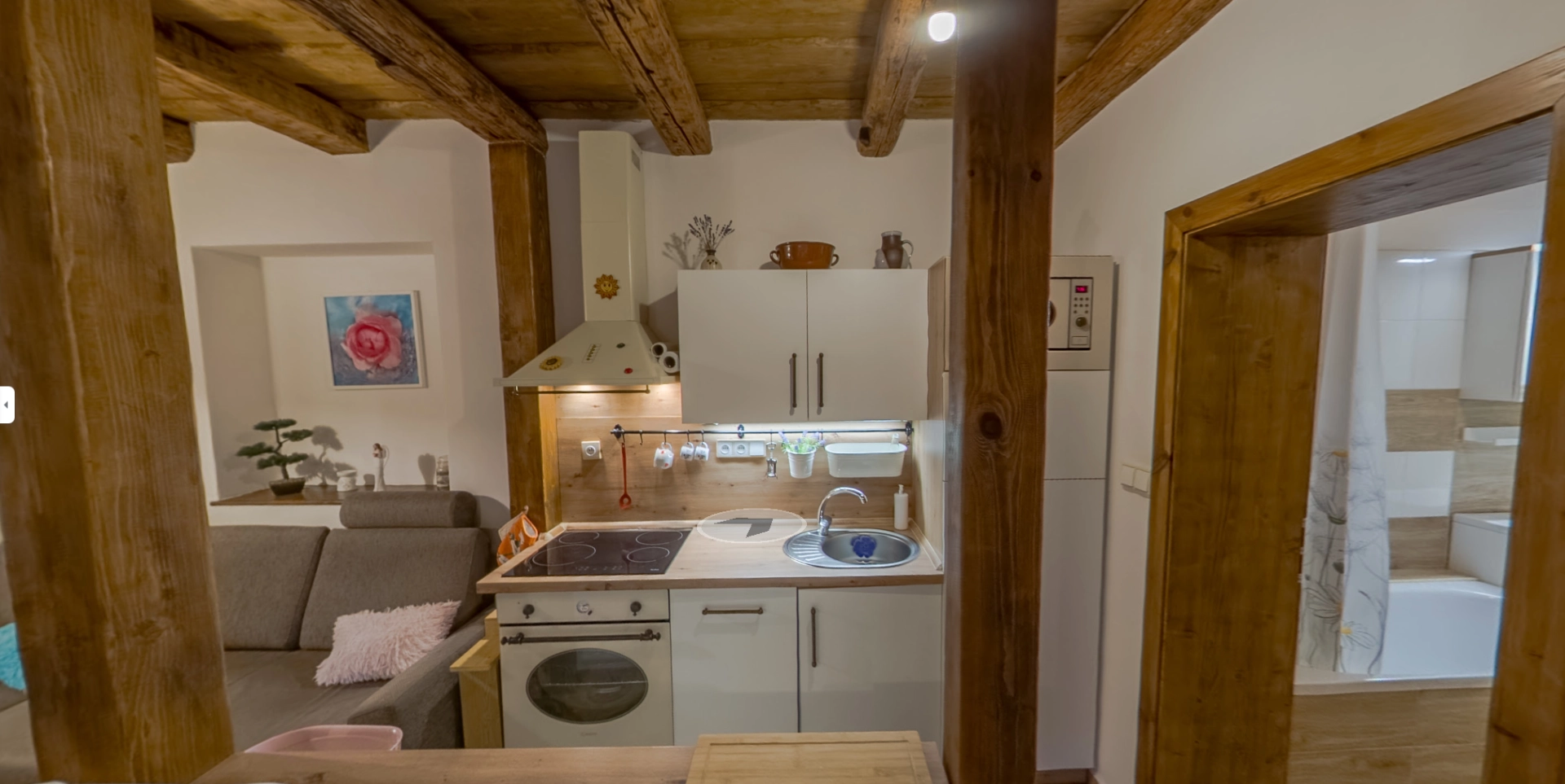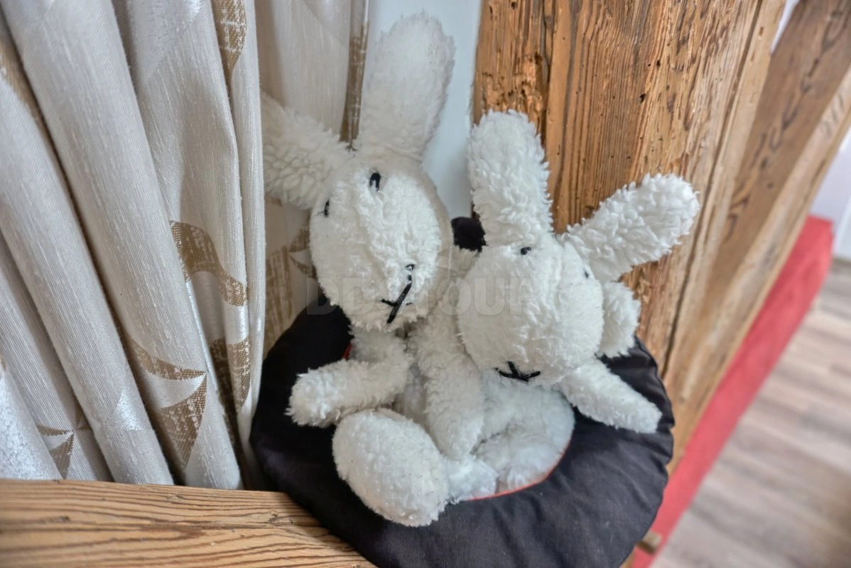 Útulná kuchyně je vybavena dřevěným stolem, bílým kredencem a nechybí ani televize. V obývací části s kuchyňským koutem se nachází pohodlná pohovka a tradiční stropní trámy vytvářejí příjemnou atmosféru. Ložnice s manželskou postelí a dalším lůžkem z masivního dřeva nabízí dostatek prostoru pro odpočinek. Apartmán je dále vybaven koupelnou s vanou a samostatným WC.