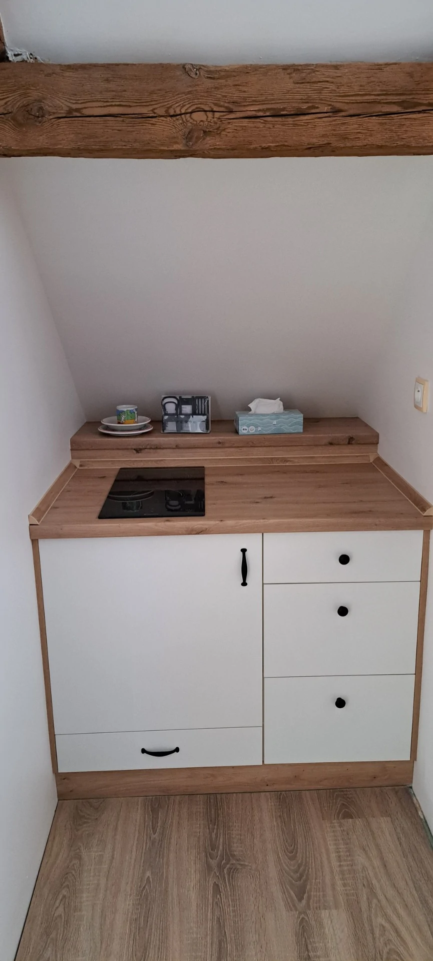 Dále kuchyňský kout s varnou deskou, mikrovlnnou troubou a varnou konvicí. V koupelně je k dispozici sprchový kout, WC a umyvadlo.